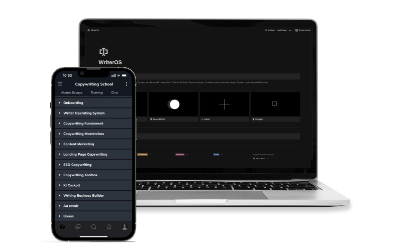 Ohne Ziel kommst du nicht an – und ohne System bleibst du nicht dran. Deswegen bekommst du Zugang zum Writer Operating System. Mit dieser Software erstellst du auf Knopfdruck 100+ Vorlagen für effektive Texte.