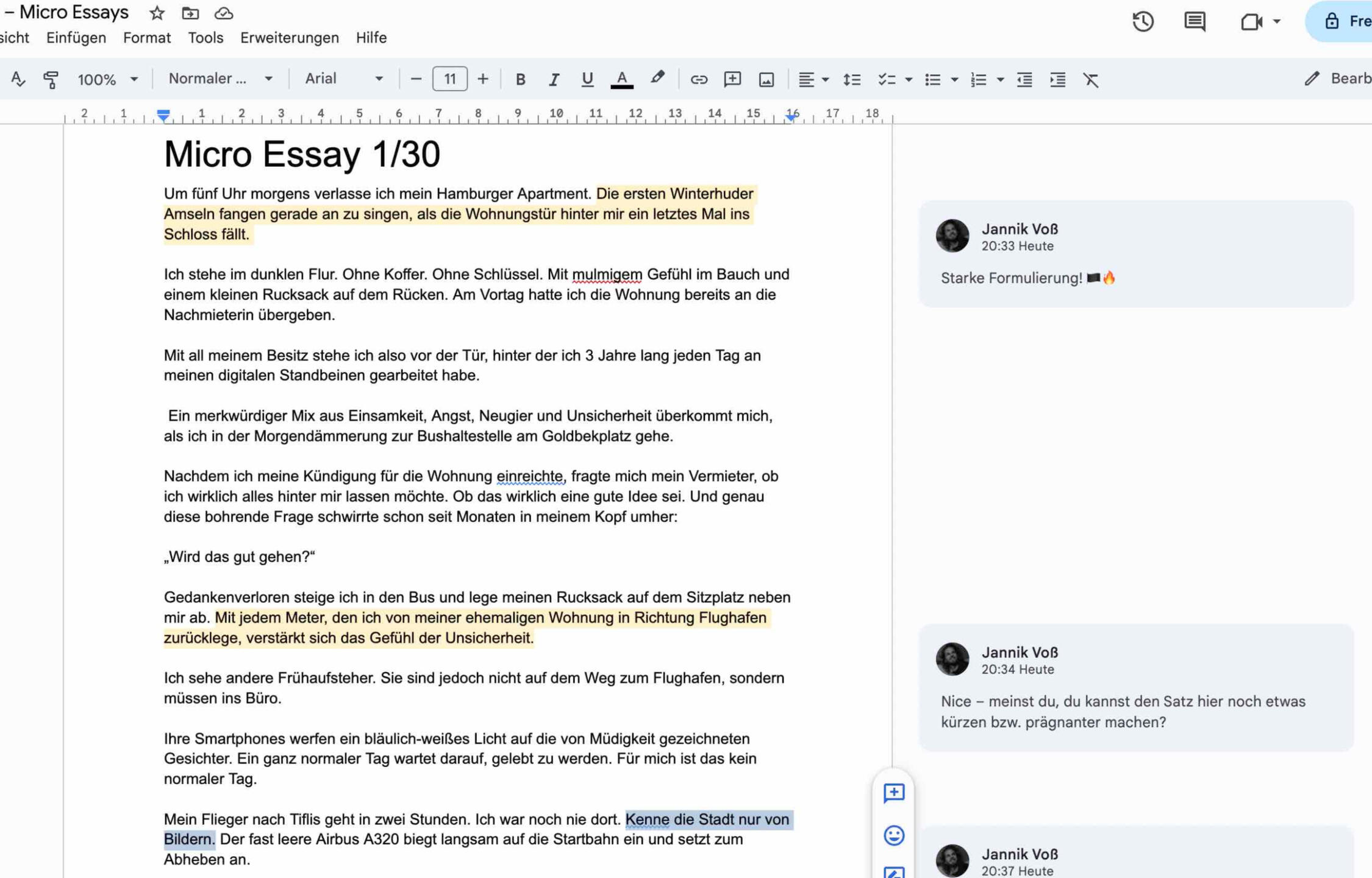 Ja. Du wirst 3 deiner Texte zum Review einreichen und bekommst zeitnah ein detailliertes Feedback.So stellen wir sicher, dass du schnell ein Bewusstsein für deine Verbesserungspotentiale entwickelst und jeden Tag 1 % besser wirst.Du bekommst insgesamt 3x detailliertes Live Feedback von mir oder meinem Team. Im Idealfall zu den Texten Nummer 1, 10 und 30. So profitierst du von einer steilen Lernkurve.