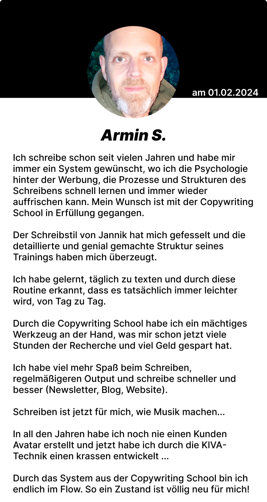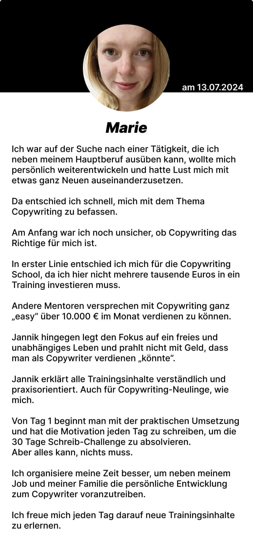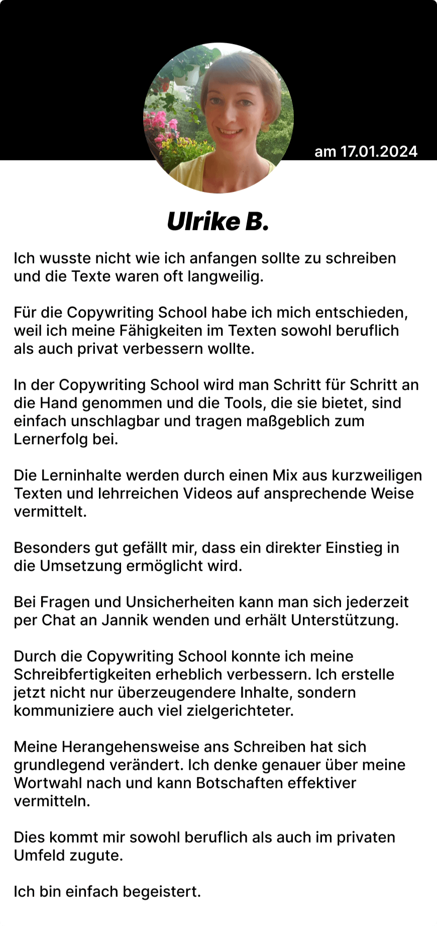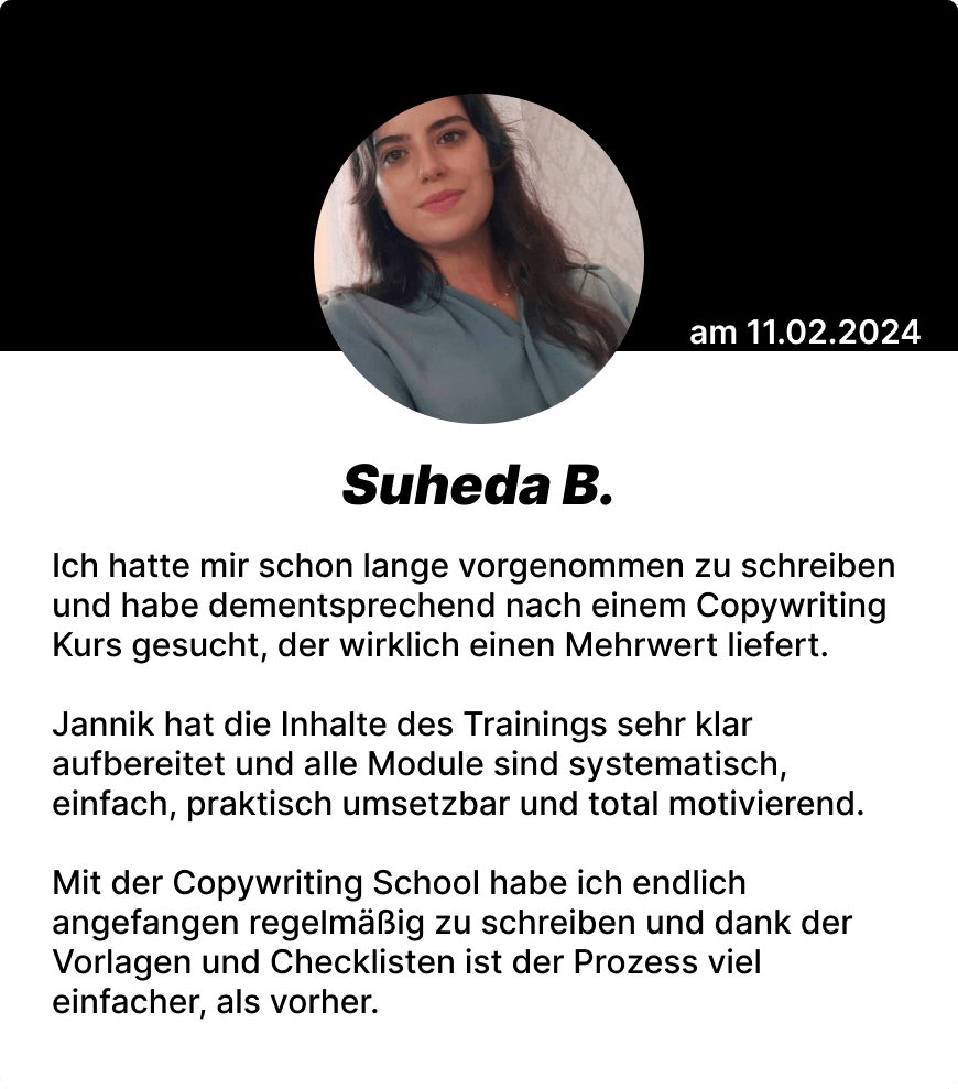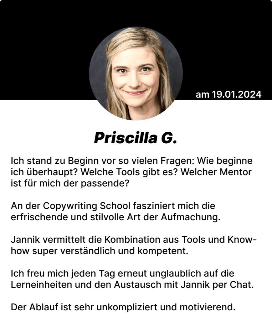 „Ich hatte mir schon lange vorgenommen zu schreiben und habe dementsprechend nach einem Copywriting Kurs gesucht, der wirklich einen Mehrwert liefert. Jannik vermittelt all seine Erfahrungen einfach, praktisch umsetzbar und total motivierend.“