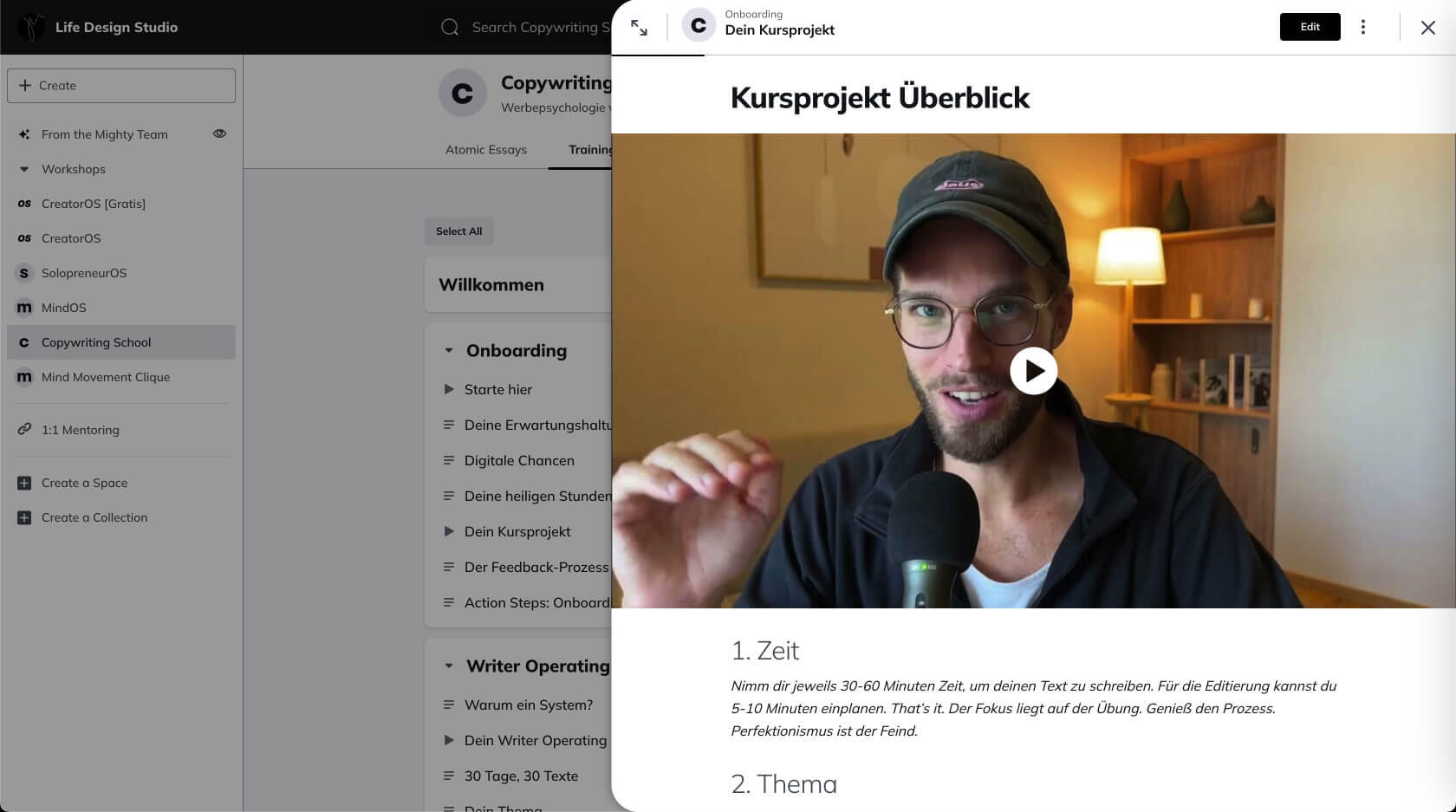 Im Life Design Studio teilst du deine Texte in der Community, nutzt den Live Chat um all deine Fragen zu stellen und lernst auf deinem Weg Gleichgesinnte kennen.Außerdem sicherst du dir meine exklusive Writer Operating System Software mit 100+ Vorlagen, Formeln und Automatisierungen für dein zukünftiges Digital Writing Business.Alle Inhalte eignest du dir natürlich in deinem eigenen Tempo an.