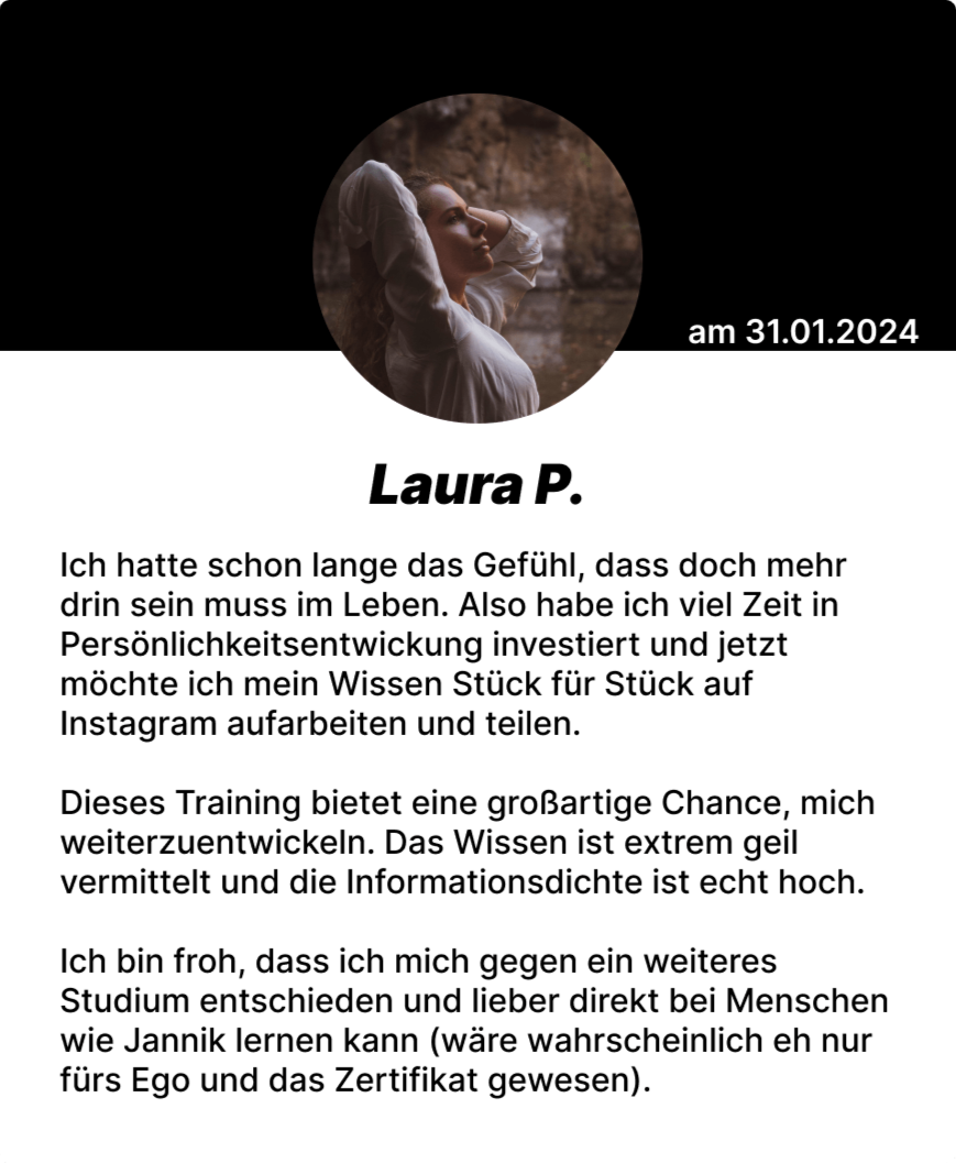 „Ich hatte schon lange das Gefühl, dass doch mehr drin sein muss im Leben und bin froh, dass ich mich gegen ein weiteres Studium entschieden und lieber direkt bei Menschen wie Jannik lernen kann (wäre wahrscheinlich eh nur fürs Ego und das Zertifikat gewesen).“